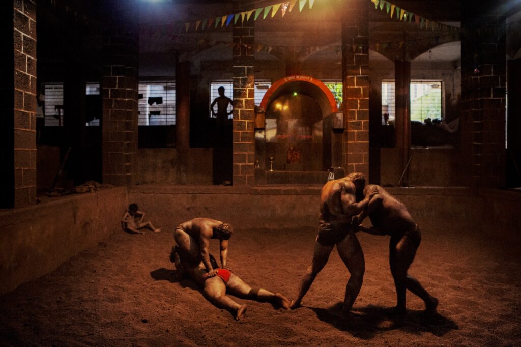En Inde, pays en transformation rapide, perdure une tradition de lutte ancestrale : le kushti. Dans les akharas, des athlètes de toutes générations se retrouvent chaque jour, sans distinction de caste ni de religion. Cette discipline, pourtant, disparaît peu à peu. Héritée de la Perse et pratiquée en Inde depuis le XVIe siècle, elle se déploie dans des fosses d’argile rouge mêlée de beurre clarifié et d’épices, une terre considérée comme sacrée. En s’en couvrant, les lutteurs accomplissent un rituel de purification, apaisent les douleurs et prolongent leur préparation. Leur routine exigeante façonne des combats pouvant durer jusqu’à vingt-cinq minutes. Ces images ont été réalisées dans deux akharas : à Kolhapur, dans le Maharashtra, et dans un quartier d’Agra, en Uttar Pradesh.